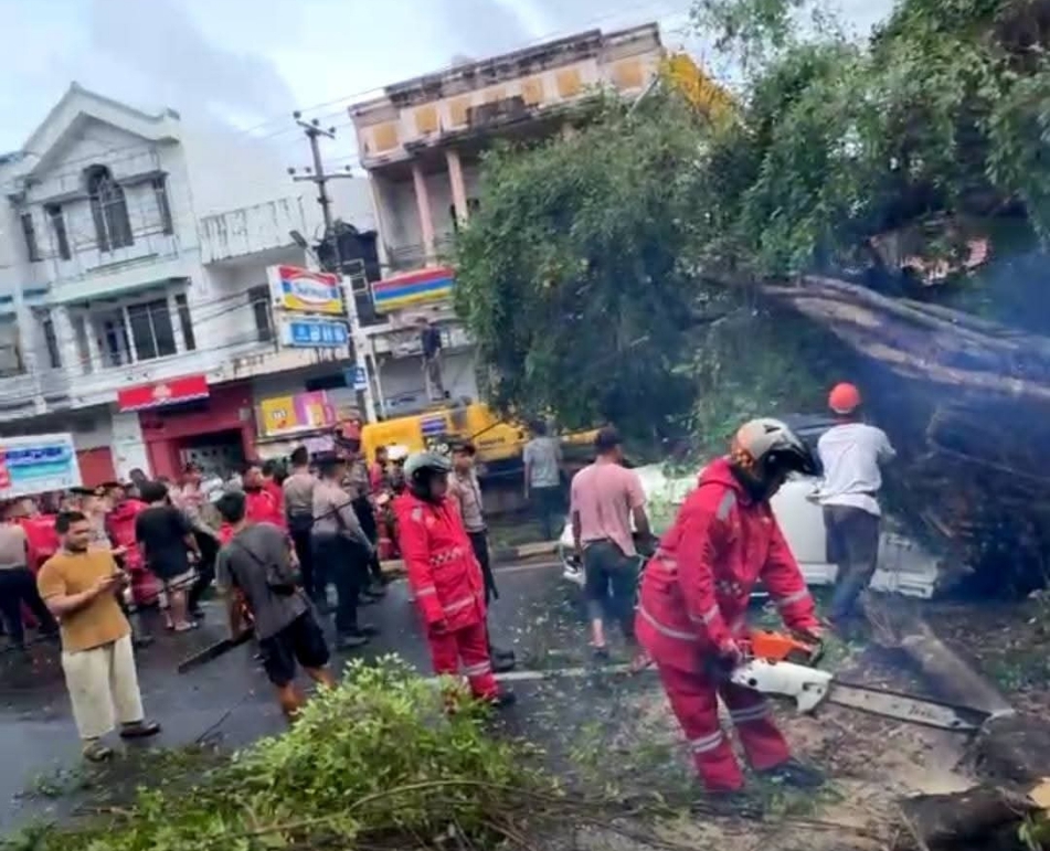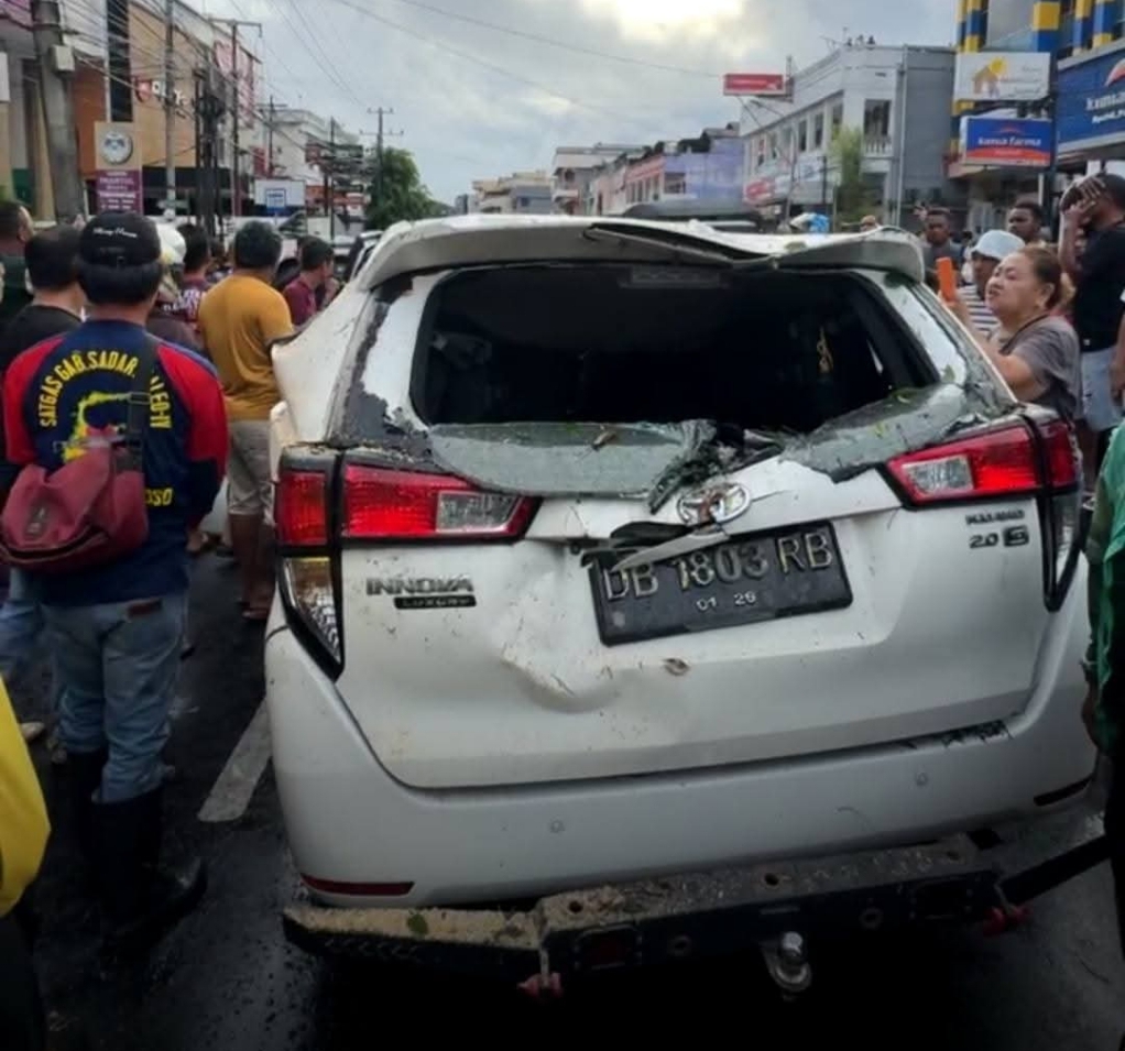 Cuaca ekstrem kembali melanda Kota Manado pada Jumat (14/11/2025). Sebuah pohon besar tumbang di Jalan Wolter Monginsidi, Lingkungan Bahu, Kecamatan Malalayang, hingga menimpa satu unit kendaraan yang sedang melintas dan menutup sebagian badan jalan.